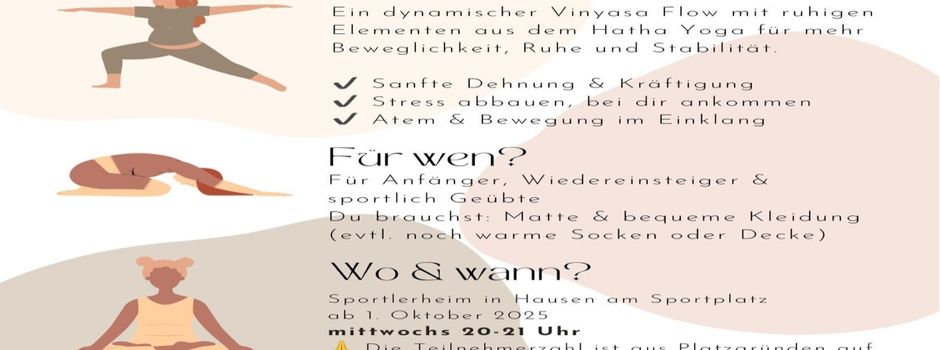 Im Sportlerheim der SG Balduinstein in Hausen findet ab Mittwoch den 01.10.25 von 20-21Uhr ein neuer Yoga-Kurs statt. Kursleiterin ist Patricia Baumann. Nutze intensiv 1 Stunde Auszeit vom Alltag um Kraft zu tanken, die innere Ruhe zu finden und Körper und Geist in eine Balance zu bringen. Beim dynamischen Vinyasa-Yoga lernt man das Zusammenbringen von Atmung und Bewegung. Das stärkt sowohl die Muskulatur als auch den Geist. Der Kurs ist sowohl für Anfänger als auch Wiedereinsteiger und sportlich Aktive Menschen geeignet.Benötigt wird eine Yoga-Matte und sportliche Kleidung. Die 10er-Karte kostet für Mitglieder der SG Balduinstein 40€ und für Nicht-Mitglieder 100€. Durch die Räumlichkeiten im Sportlerheim ist die Anzahl der Teilnehmer auf 12 Personen beschränkt. Der Vorstand der SG Balduinstein und Patricia Baumann hoffen Ihr/Euer Interesse an dem Kurs geweckt zu haben und wünschen allen Teilnehmern einen guten Flow.